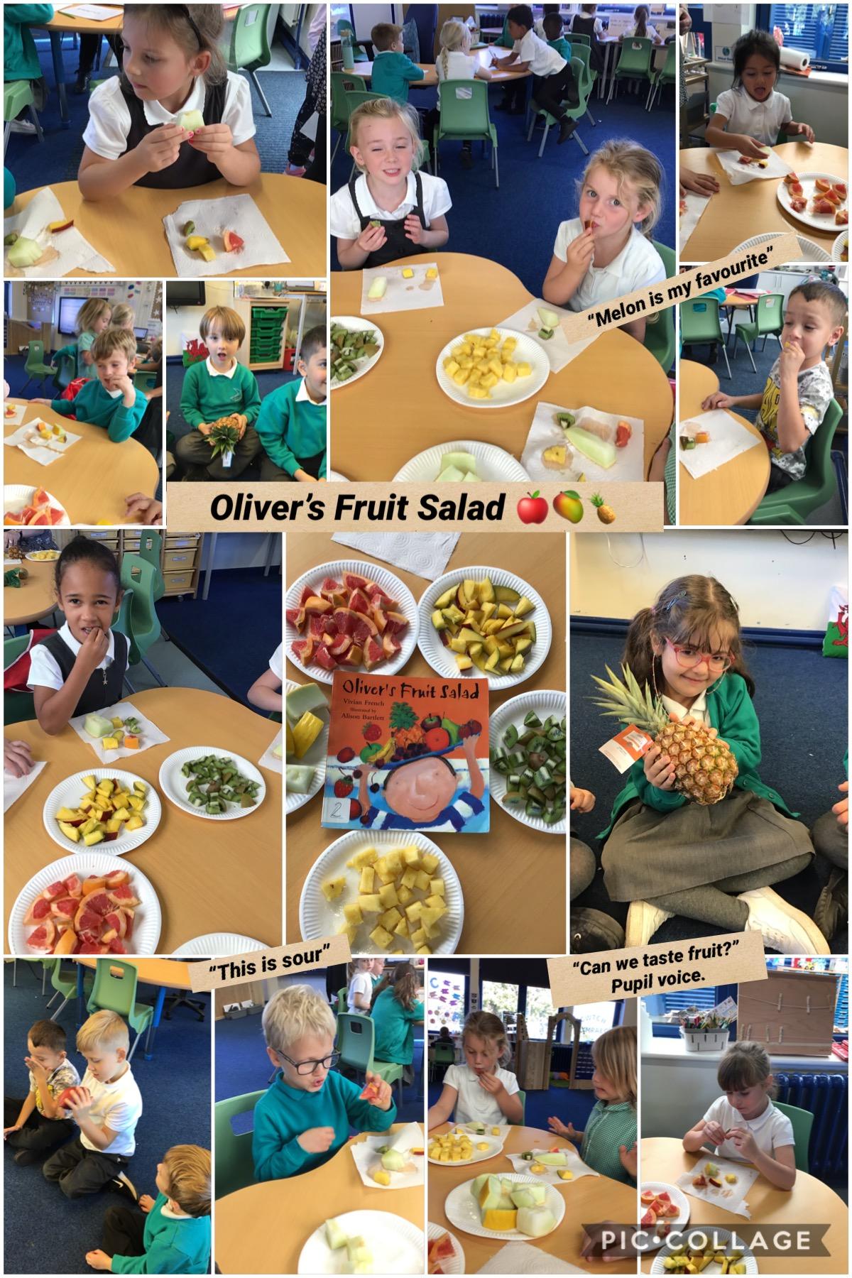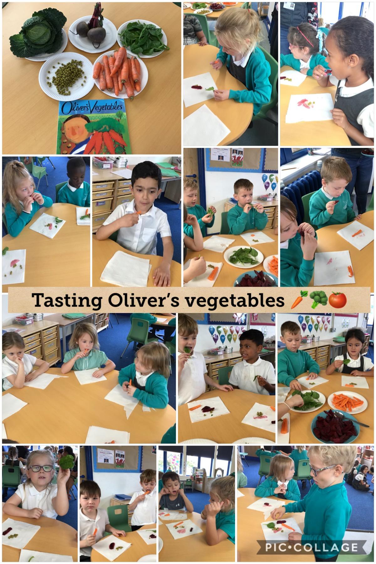We read the book 'Oliver's Vegetables.' Oliver didn't like vegetables so we decided to try some of the vegetables his Grandad grew in his garden.