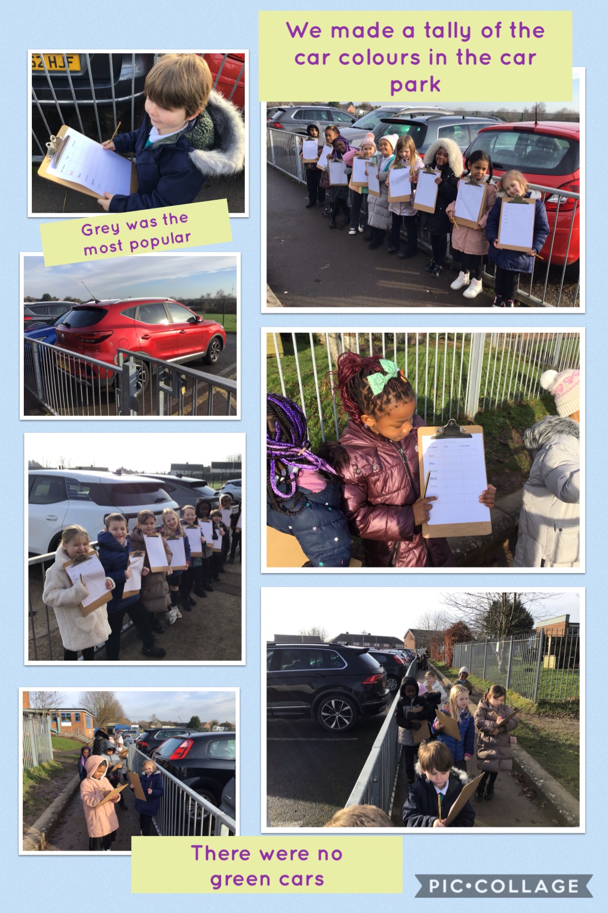 - collecting data about the colours of cars in the School car park